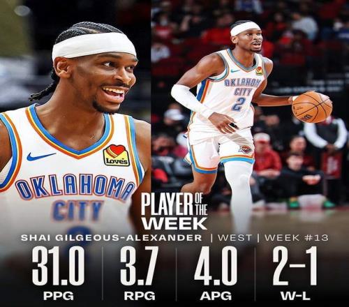 过去一周,亚历山大率领雷霆打出2胜1负的战绩,场均31分3.7篮板4助攻2盖帽,投篮命中率54.7%。