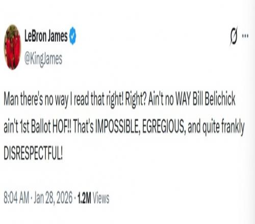 对此,湖人球星詹姆斯更推道:“天哪,我肯定看错了!比尔·贝利奇克怎么可能不是第一轮就入选名人堂?这简直是不可能的,荒谬的,坦白说,这是极大的不尊重!”